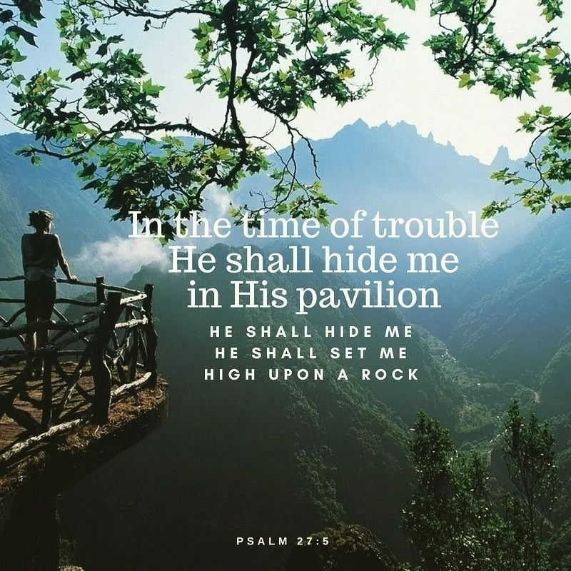 Psalm 27:5 "For in the day of trouble he will keep me safe in his dwelling; he will hide me in the shelter of his sacred tent and set me high upon a rock"