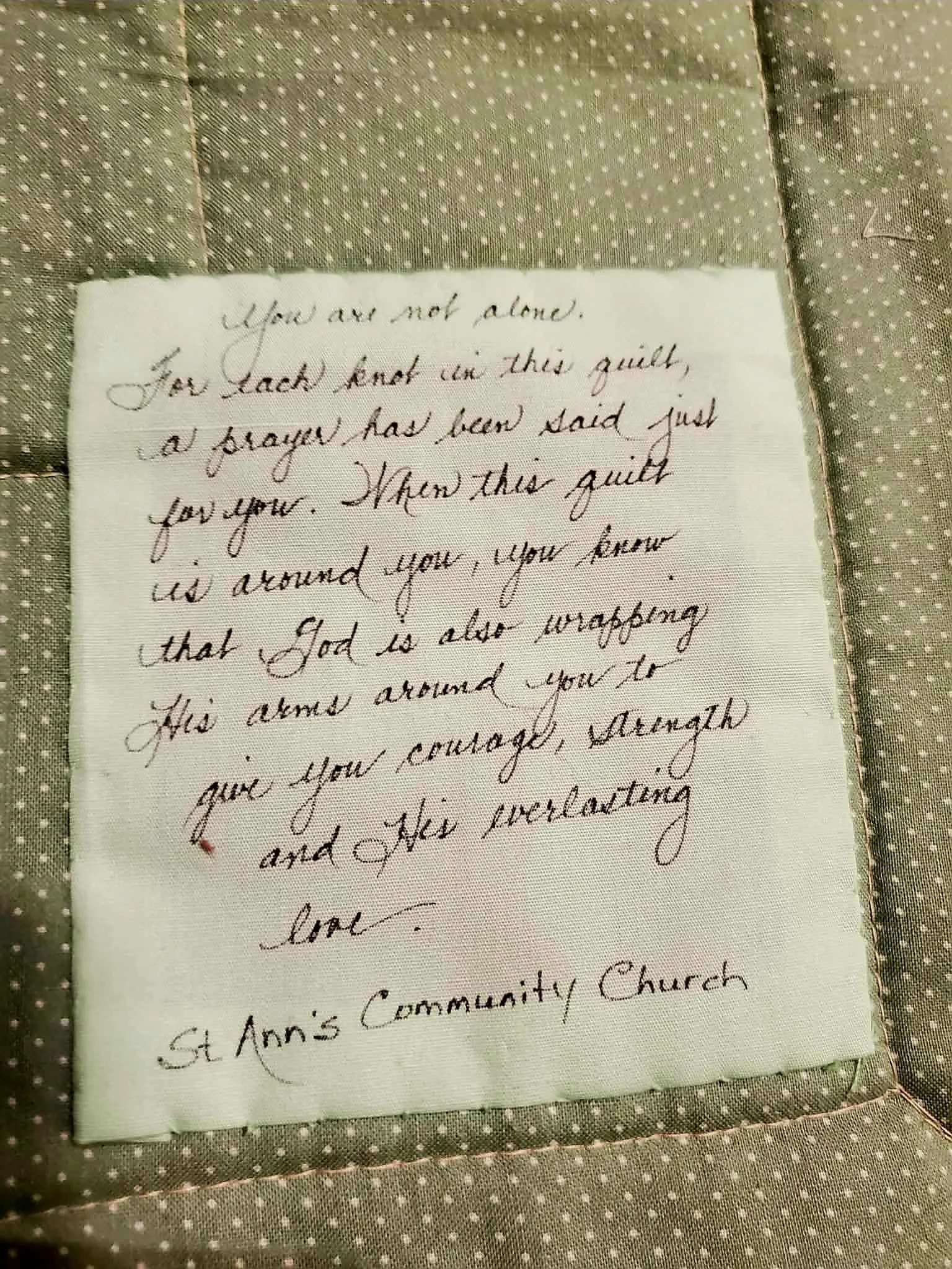 As I have been typing this, I received a beautiful gift of love my Mom shared with me from St. Anns Community Church. The church is sewing me a prayer quilt. I have attached a photo below of the words written on the back of the quilt. It brought tears to my eyes. It has been again, so humbling, and incredibly helpful, while stumbling through the daily trials (and they seem to have been daily!), to be lifted up and part of the family of God. I have many armies lifting their voices in prayer and there is no more beautiful a song than I can imagine.
